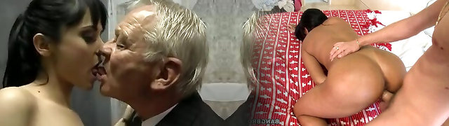 Hot brunette fucks two old guys and gives oral jobs