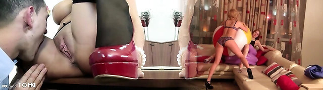 Loose labia of old granny is getting stretched in kinky FFM 3some