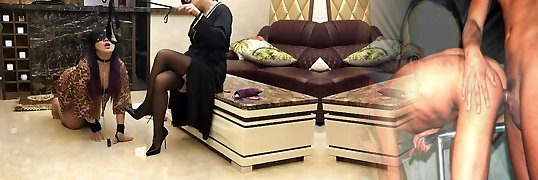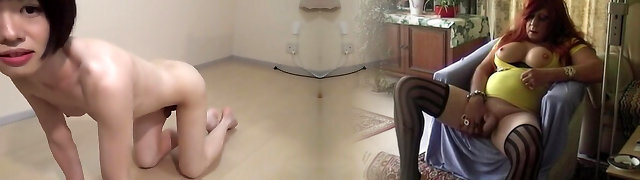 Asian mature woman in tights humiliates crossdresser lounging on the floor