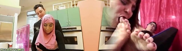 Perverted granny and sweet looking brunette teen have crazy hook-up fun in the kitchen