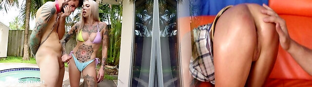 Slender Tattooed Blonde Teases Her Sex-slave With an Exciting Outdoor Hand Job But Doesn't Let Him Cum