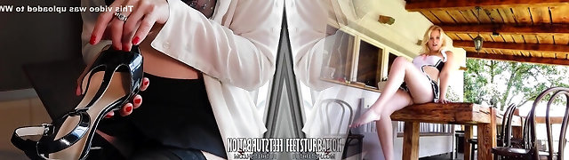 College Lecturer in pantyhose and high heels gives handjob on her legs