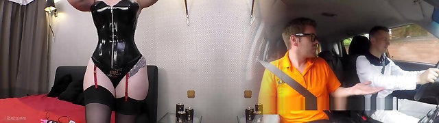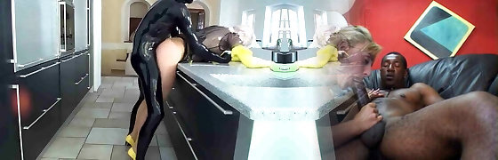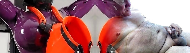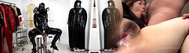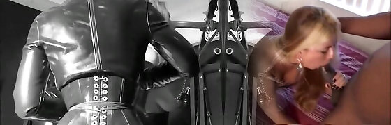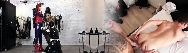 Naughty guy in a latex suit fucks his plump maid slave