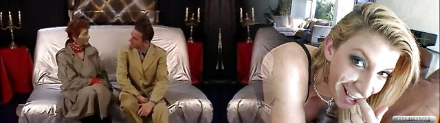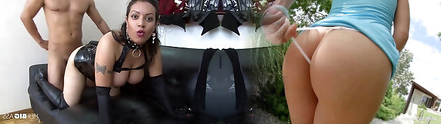 Latex mistress wearing strapon Anikka Albrite and her master fuck one obedient chick