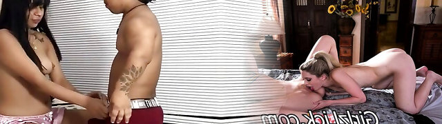 Midget lesbian plays with dildo in long legged buddy's cunt in bed