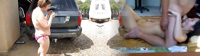 Voluptuous mature woman masturbating outdoor leaning over my van