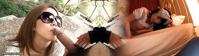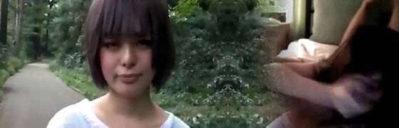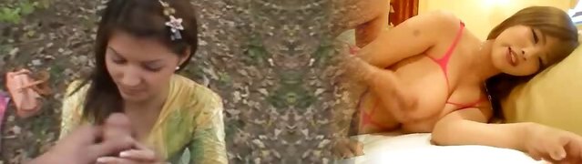 Cute chestnut haired Japanese dame Emiko Shinoda gives a BJ outdoors