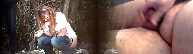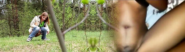 Chubby European redhead crouches and pisses in the park