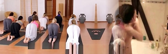 Tatted stepsisters swarm their yoga teacher with their bodies