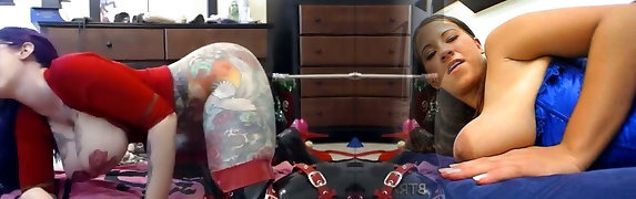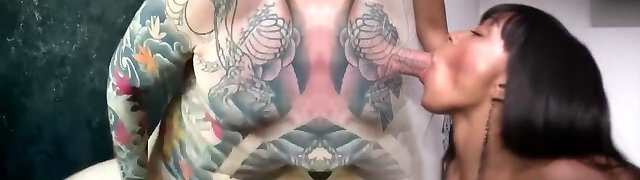 Wild inked sluts get their anal screwed with huge dildos and hard real pounding in FFM threesome