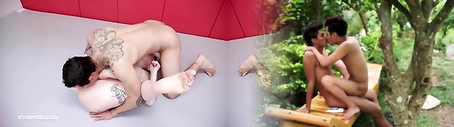 Teens covered with oil wrestle and fuck one prick