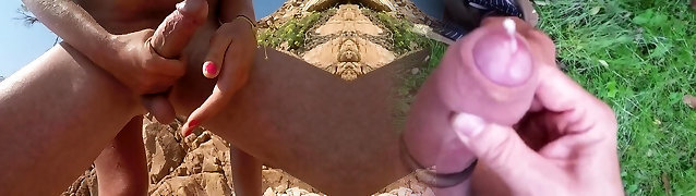Hot chick playing with a stranger's stiffy on the beach