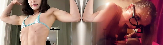 Asian FBB in micro bathing suit shows muscles and lil clit-dick