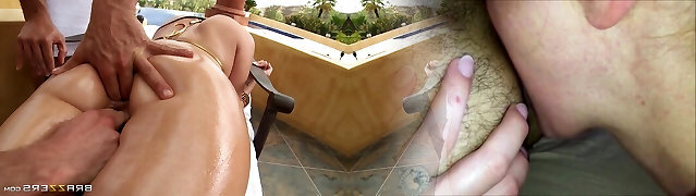 Two fellows are going to bang this oiled up booty
