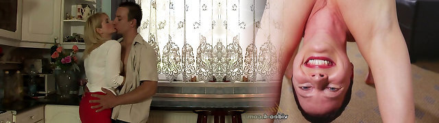 Big-titted blond mommy in glasses pokes with her buddy on table