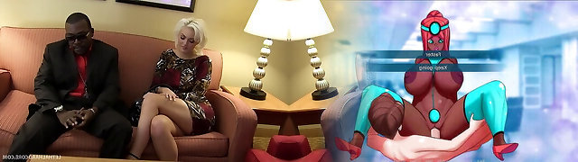 High-heeled towheaded whore with awesome juggs deep-throating a huge black cock