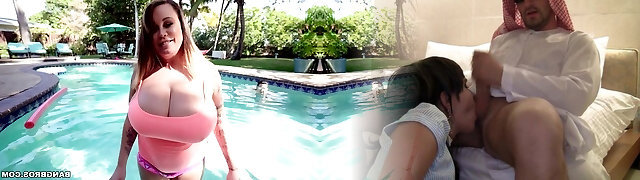 Curvaceous white woman displays off her enormous breasts in the pool