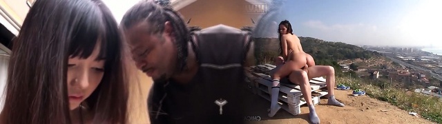 Lil Japanese girl gags on big black cock outdoors