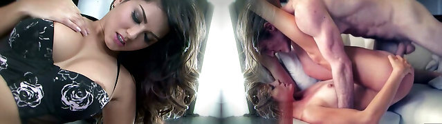 Zealous bosomy black-haired Sunny Leone plays with her massive boobies and rubs clit