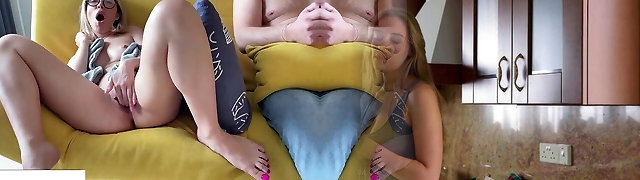Short blonde in glasses squirts after jerking solo next to her BF