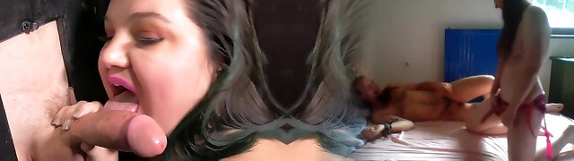 Sweet milky brunette girl in the gloryhole feeds and fucks on thick black dicks