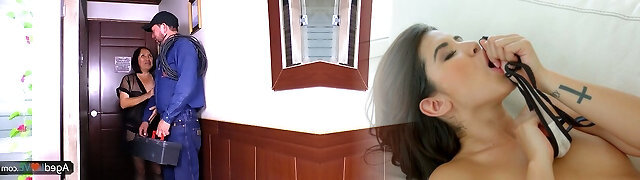 Mature whore wife Andrea is cheating on her husband with a wire guy