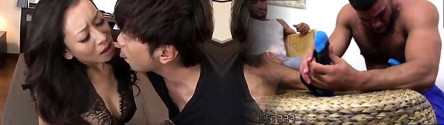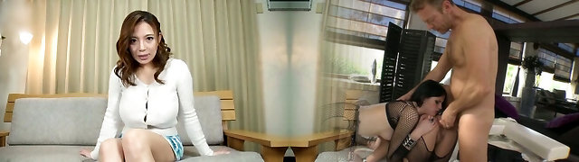 Japanese cougar sucking and getting boned in her hairy pussy-lips