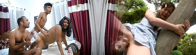 Bubbly Asian wife with gigantic tits gets her hairy twat fingered then throbbed hardcore