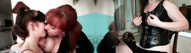 Juggy crimson haired milf seduces cute brunette and kisses her