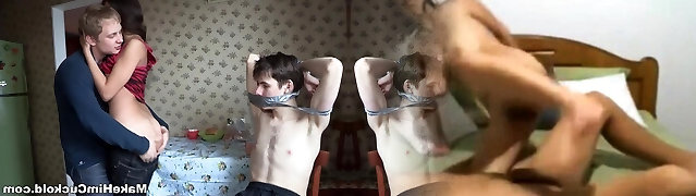 Gagged and tied up cheating BF watches naughty teen riding best buddy