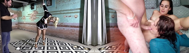 Not pretty blond maid Sara forgets about cleaning and sucks trio dicks