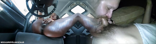 Caught sexy curly ebony stunner Demi Sutra masturbating in a car and fucked her on a bed