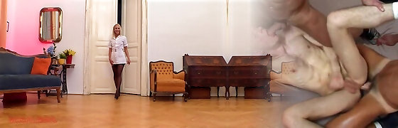 Blonde nurse in nylons Cecilia Scott blows and rails an senior guy