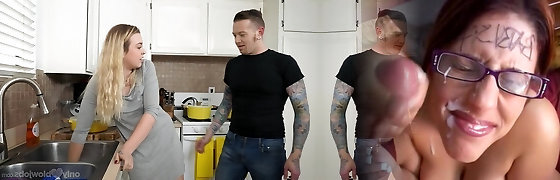 Housewifely girlfriend Ashley Manson provides tattooed Boyfriend with a blowjob