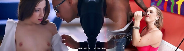 Hot tarts riding one hard cock in FFM threesome after giving head
