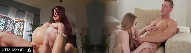 Pregnant redhead Emma Rose tranny rides Ariel Demure's enormous cock after yoga with her ass-fuck