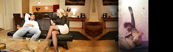 Skinny honey in stockings gets an orgasm from hard porn with Mr...