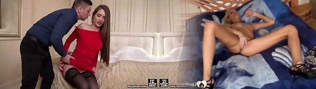 Sexy lady in red dress and dark-hued stockings Mary Rock gets her bulls eye fucked