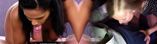 Diamond Foxxx sucks two hard schlongs before taking them in her depths