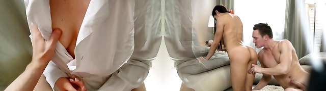 Two gorgeous brunettes share a hard dick and bellow with elation