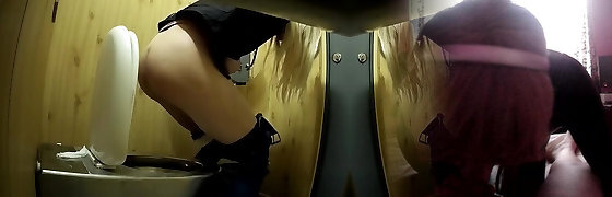 Mischievous chick licking lesbian friends pussy in public toilet