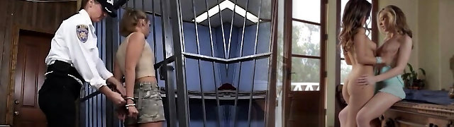 Dressed like a police officer dude finds two foreign girls to have hook-up with