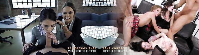 Voracious black haired cheerleader girl gets double teamed