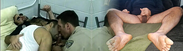 Burly cop dressed in sunglasses sucks cocks and gets his butt fucked in an all-male threesome