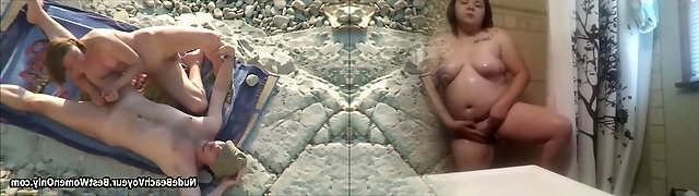 I spy on sis in the shower while she is masturbating puss with a dildo