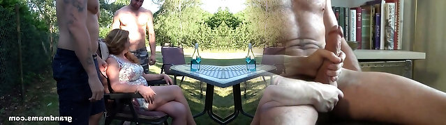 Husband is watching his mature wife romping 2 horny young dudes in the garden